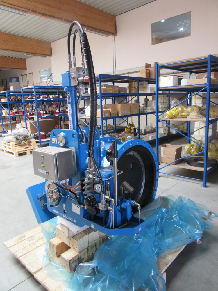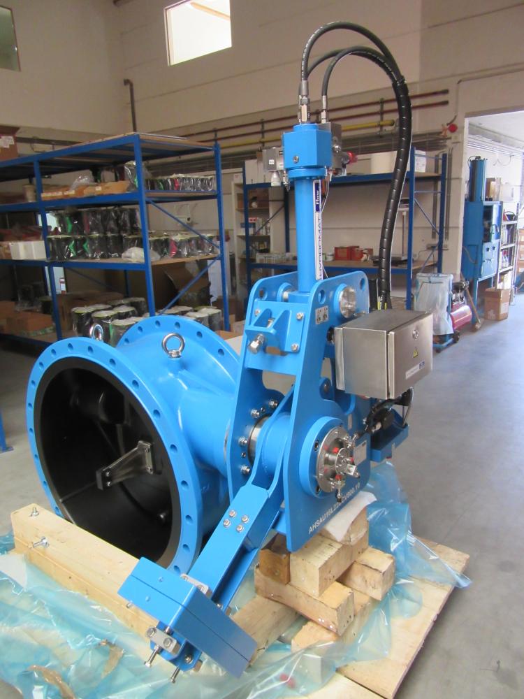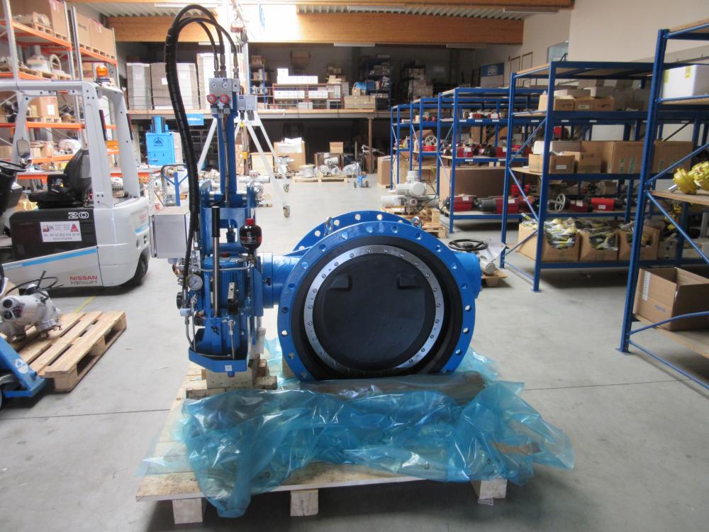 DN 800 MIV Butterfly check valve with electro-hydraulic shock absorber system with 2 stage closing system. Body & disc hard rubber lined